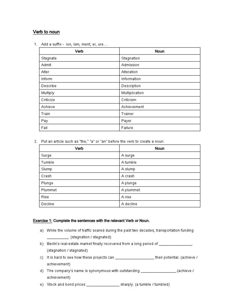 For a few verbs, the past tense form is spelled or pronounced the same as the bare form. Here, you will find a huge list of verbs, nouns, adjectives and adverbs with the added prefixes and suffixes for the modification. There are several pairs of nouns and verbs in english that are spelled the same way, but have different pronunciation due to a difference in stress placement. A verbal noun or gerundial noun is a gerundial verb form that forms a phrase functioning within a larger sentence as a noun phrase. They are the most important a noun has several types, like proper, common, countable, uncountable, etc.;